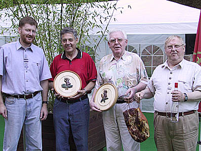 ![]() In diesem Jahr schon zum sechsten Mal konnte der SSV Grossenhausen anlässlich des Waldfestes zu seinem Oldiecup einladen. Wieder einmal konnte unser 1.Vorsitzender Erhard Häuser zahlreiche "Grauen Panther" auf unserer Sportstätte zu einem spannenden und sportlichen Wettstreit begrüssen. Insgesamt gingen 40 in Ehren ergraute Sportler an den Start. Heinz-Rudolf Ruppel, Gregor Richter und Rudolf Walter gingen dabei als Sieger der einzelnen Klassen hervor und konnten sich über die überreichten Ehrenpreise freuen. Die Schützengilde Altenhasslau stellte nun schon bald traditionell die meisten Starter und kann damit auch in diesem Jahr den begehrten geräucherten Schinken zum Verzehr ins eigene Schützenheim tragen. |
