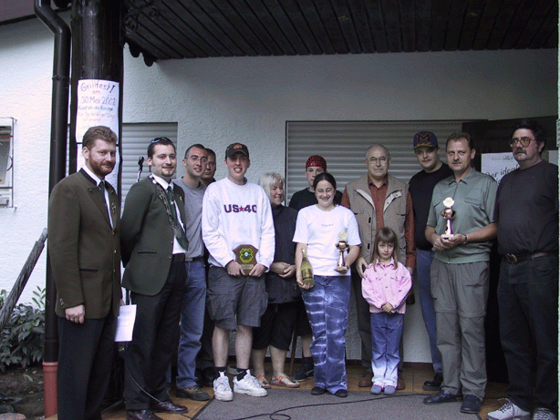 Bester Schütze in der Einzelwertung wurde Friedel Herbst mit hervorragenden 141 Ringen. Ihm folgte dicht auf den Fersen auf Platz zwei, Jörg Hofacker mit 138 Ringen. Platz drei und vier waren Ringgleich. Hier mussten die mehr geschossenen Zehner für eine Entscheidung herangezogen werden. Hier hatte Richard Reitz bei erzielten 134 Ringen mit mehr Zehnern die Nase vorn. Susanne Bösser musste sich bei gleicher Ringzahl mit Platz 4 zufrieden geben. In der Mannschaftswertung konnten sich die "Warmduscher" mit 390 Ringen klar den Titel des Ortsvereinmeisters gegen den PSSV Grossenhausen 2 mit 385 Ringen sichern. Wie auch in der Einzelwertung mussten die Zehner für die Entscheidung um Platz drei herangezogen werden. Hier hatte der ACG Grossenhausen 2 mit 11 Zehnern gegen 9 Zehner des FSV Grossenhausen 2 bei gleicher Ringzahl von 384 Ringen den Vorteil auf seiner Seite und somit auch den dritten Platz inne. |