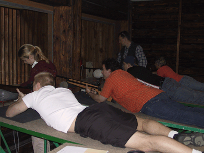 Geschossen wurde wieder nach dem bewährten Modus: mit dem Kleinkalibergewehr liegend aufgelegt auf 50 Meter Entfernung werden 15 Schuss Wertung abgegeben. Eine Mann/Frauschaft besteht aus drei Schützen. |